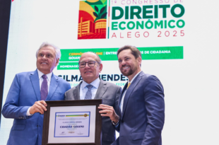 O governador de Goiás, Ronaldo Caiado (União), concedeu nesta sexta-feira (13) o Título de Cidadania Goiana aos ministros Dias Toffoli e Gilmar Mendes, do Supremo Tribunal Federal (STF), e ao procurador-geral da República, Paulo Gonet. A homenagem foi realizada na Assembleia Legislativa de Goiás (Alego) durante o 1º Congresso Goiano de Direito Econômico. Caiado disse que Goiás pode “respirar por …