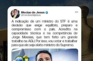 Líder do Republicanos no Senado Federal, o senador Mecias de Jesus (RR) fez uma manifestação de apoio à indicação do advogado-geral da União (AGU), Jorge Messias, para o Supremo Tribunal Federal (STF). Messias seria o favorito do presidente Lula para ser indicado para a vaga. O parlamentar Mecias é um integrante da bancada evangélica ligado à Igreja Batista, a mesma …