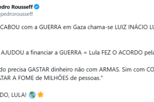 O vereador de Belo Horizonte Pedro Rousseff (PT), sobrinho da ex-presidente Dilma Rousseff, disse, em postagem na rede social X desta terça-feira (14), que “Quem ACABOU com a GUERRA em Gaza chama-se LUIZ INÁCIO LULA DA SILVA! (sic.).” O presidente Lula (PT) não teve qualquer envolvimento no acordo de paz entre Hamas e Israel. Como embasamento, ele simula uma equação …