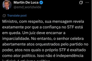 O representante de Donald Trump em disputas judiciais no Brasil, Martin de Luca, criticou o ministro Gilmar Mendes por seu elogio às manifestações. Para o advogado, a mensagem do ministro fere a imparcialidade e mostra por que o STF enfrenta desconfiança. “Um juiz deve encarnar a imparcialidade. No entanto, o senhor celebra abertamente atos orquestrados pelo partido no poder, atos …