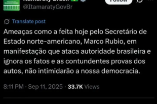 “Ameaças não intimidarão nossa democracia”, disse o Ministério das Relações Exteriores no X. O comentário desta quinta-feira (11) à noite foi uma resposta a uma mensagem anterior do secretário de Estado americano Marco Rubio, que prometeu uma “resposta adequada” à condenação do ex-presidente Bolsonaro. A Primeira Turma do Supremo Tribunal Federal (STF) formou maioria nesta quinta para condenar Jair Messias …