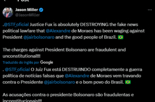 O estrategista do presidente dos Estados Unidos, Donald Trump, Jason Miller, comemorou nesta quarta-feira (10) o voto do ministro Luiz Fux, do Supremo Tribunal Federal (STF), que rejeitou a acusação de organização criminosa contra o ex-presidente Jair Bolsonaro e outros sete réus investigados pela suposta tentativa de golpe de Estado no Brasil. “O ministro Fux está absolutamente destruindo o falso …