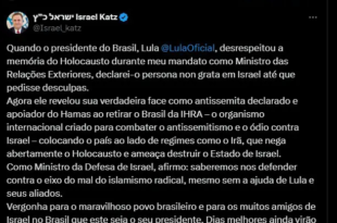 O ministro da Defesa de Israel, Israel Katz, acusou nesta terça-feira (26) o presidente Luiz Inácio Lula da Silva (PT) de ser “antissemita declarado” e “apoiador do Hamas”. A declaração foi feita em uma publicação no X, na qual o ministro criticou duramente a decisão do governo brasileiro de retirar o país da Aliança Internacional para a Memória do Holocausto …