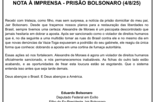 O deputado licenciado Eduardo Bolsonaro, filho do Jair Bolsonaro, afirmou que a a decisão tomada por Alexandre de Moraes, ministro do Supremo Tribunal Federal (STF), que determinou a prisão domiciliar do ex-presidente é “abuso de poder”. O filho de Bolsonaro falou em postagem no X e divulgou nota à imprensa. Eduardo disse que a prisão foi feita “sem crime, sem …