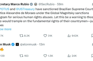 O empresário americano de origem sul-africana Elon Musk, dono do X, comemorou na tarde desta quarta-feira (30) as sanções que o governo Donald Trump impôs ao ministro do Supremo Tribunal Federal (STF) Alexandre de Moraes, com base na Lei Magnitsky, que visa acusados de violar direitos humanos e de corrupção. Musk, que no ano passado protagonizou uma disputa com Moraes, …