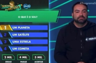 Reprodução O participante escolheu a primeira opção e afirmou que o Sol é um planeta. Reprodução O participante escolheu a primeira opção e afirmou que o Sol é um planeta. VINICIUS VELOSO DO METRÓPOLES No último domingo (20/7), o SBT exibiu a participação de um jogador chamado Paulo no Show do Milhão. Ele decepcionou o público ao errar uma resposta …