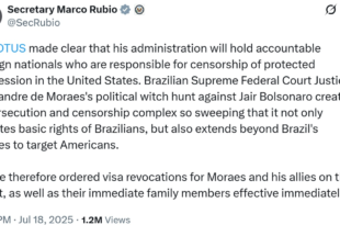 Ler mais »Secretário de Estado dos EUA revoga visto de Alexandre de Moraes e “aliados” do STF