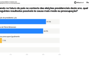 A nova pesquisa AtlasIntel/Bloomberg, divulgada nesta quarta-feira (25) mediu qual resultado eleitoral causa mais medo ou preocupação ao eleitor no comparativo entre Luiz Inácio Lula da Silva (PT) e Flávio Bolsonaro (PL-RJ). O dado ajuda a entender o peso do voto defensivo em um cenário de polarização. Segundo o levantamento, 47,5% afirmam que a reeleição de Lula é o resultado …