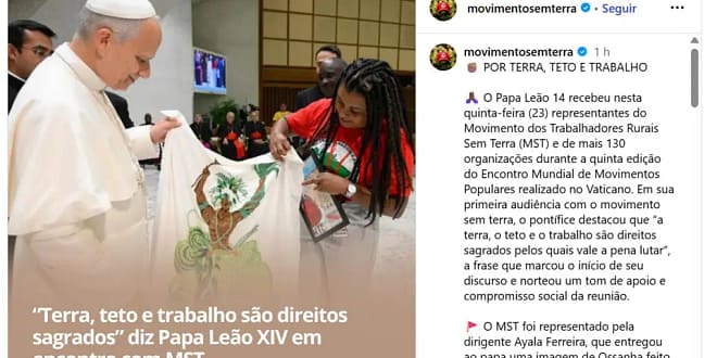 “A Igreja apoia suas justas lutas por terra, moradia e trabalho. Como meu antecessor Francisco, acredito que os caminhos certos começam de baixo e da periferia para o centro. Suas inúmeras e criativas iniciativas podem se transformar em novas políticas públicas e direitos sociais”, acrescentou Leão XIV.