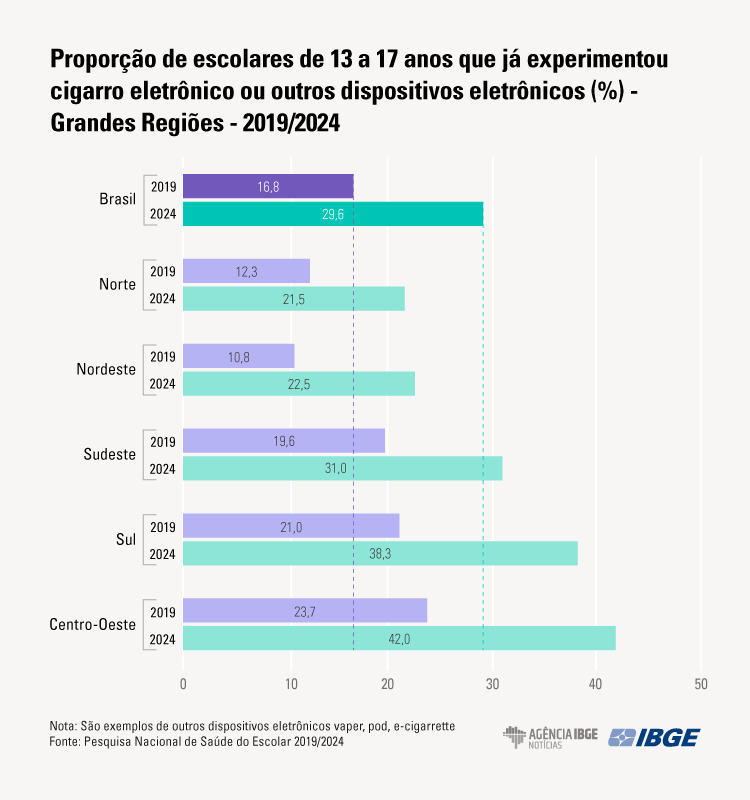 Os adolescentes de Mato Grosso e da região Centro-Oeste assumiram o topo do ranking nacional de consumo de cigarro eletrônico. De acordo com a Pesquisa Nacional de Saúde do Escolar (PeNSE), divulgada na última quarta-feira (25) pelo Instituto Brasileiro de Geografia e Estatística (IBGE), o índice de jovens entre 13 e 17 anos que já usaram dispositivos como “vapes” e “pods” atingiu 42% na região.