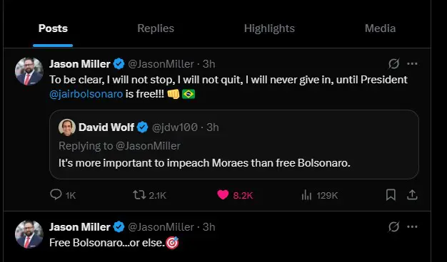 Minutos antes, Miller havia compartilhado a notícia de que os ministros do Supremo Tribunal Federal (STF) no Brasil estariam “apavorados” com a Lei Magnitsky. A informação foi publicada esta manhã por um colunista do jornal O Globo, com informações, em off, de um político influente que teria acesso direto aos magistrados.