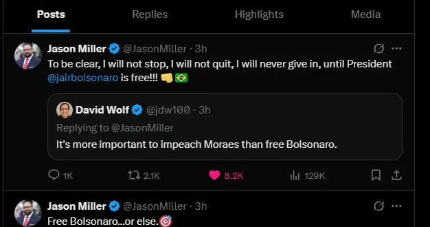 Jason Miller, estrategista de campanha do presidente Donald Trump que já foi detido no Brasil por ordem do ministro Alexandre de Moraes, afirmou neste domingo (10) que seu objetivo é a liberdade de Jair Bolsonaro.