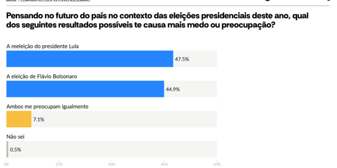 Segundo o levantamento, 47,5% afirmam que a reeleição de Lula é o resultado que mais causa preocupação. Outros 44,9% dizem temer mais a eleição de Flávio Bolsonaro. Para 7,1%, ambos preocupam igualmente, e 0,5% não souberam responder.
