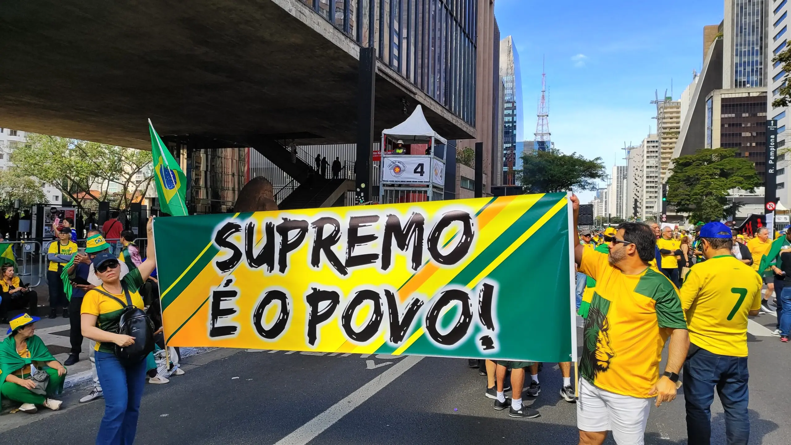 O ato em São Paulo do movimento “Reaja Brasil” foi organizado pelo pastor Silas Malafaia. Cartazes e placas criticavam os ministros do STF e o presidente da Câmara Hugo Motta (Republicanos-PB) e os classificavam como “Inimigos da Nação”. As mensagens também pressionavam pela anistia aos presos do 8 de janeiro de 2023.