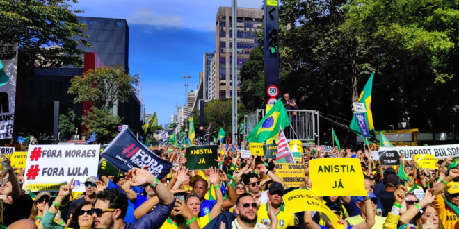 Na Avenida Atlântica, na orla de Copacabana, entre os milhares de manifestantes que se reuniram neste domingo, duas presenças de destaque: o senador Flávio Bolsonaro (PL-RJ) e o governador do Rio de Janeiro, Cláudio Castro. O parlamentar carioca afirmou, em entrevista ao site Metrópoles durante o evento, que a sanção imposta pelo governo americano a Alexandre de Moraes é uma “vergonha brasileira”.