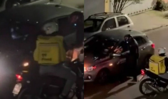 Assustada, a mulher revela a combinação, anotada pelo outro criminoso, que usa uma mochila de entrega nas costas. Em seguida, os dois assaltantes fogem, levando também um relógio e anéis da motorista.