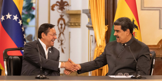 Arce também enviou um “abraço fraterno” ao governo Maduro “e ao valente povo venezuelano, que sempre foi generoso com a Bolívia”.