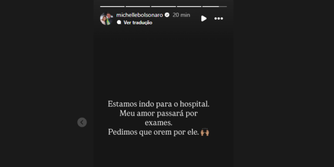 “Estamos indo para o hospital. Meu amor passará por exames. Pedimos que orem por ele”, escreveu Michelle, que prorrogou sua visita a Bolsonaro para acompanhar a situação do ex-presidente e entender como ocorreram os primeiros socorros. A PF disse que o próprio Bolsonaro relatou o acidente à equipe de plantão, recebendo atendimento médico pela manhã.