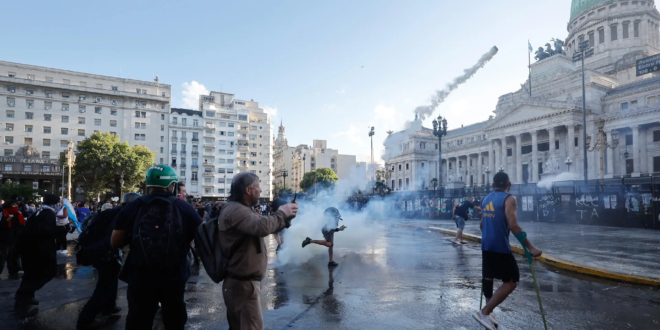 Manifestantes em confronto com a polícia durante um protesto contra a reforma trabalhista proposta pelo governo de Javier Milei, em frente ao Congresso da Argentina. Crédito: EFE/ Juan Ignacio Roncoroni (Foto: EFE/ Juan Ignacio Roncoroni)