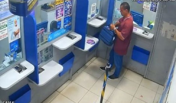 Uma câmera de segurança flagrou o momento em que um bandido furtou uma caixinha de doações que estava sobre o balcão de uma lotérica da Caixa Econômica Federal, na tarde desta segunda-feira (12), em Cuiabá. O crime aconteceu de forma discreta, enquanto o local seguia em funcionamento normal.