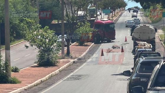 Um caminhão causou transtornos e deixou o trânsito completamente congestionado na Avenida República do Líbano, em Cuiabá, na manhã de hoje (2) após parar atravessado sobre o canteiro central e ocupando as pistas nos dois sentidos da via.