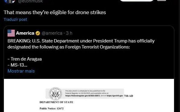 O empresário Elon Musk afirmou nesta quarta-feira (19) que os cartéis de drogas e facções criminosas recentemente designados como organizações terroristas pelo governo dos Estados Unidos, liderado pelo presidente Donald Trump, agora estão elegíveis para ataques com drones. O CEO da Tesla e da SpaceX fez tal declaração ao compartilhar um post feito pelo seu comitê de ação política, o America PAC, no X, informando que o Departamento de Estado havia oficializado a designação de diversos grupos criminosos como terroristas.
