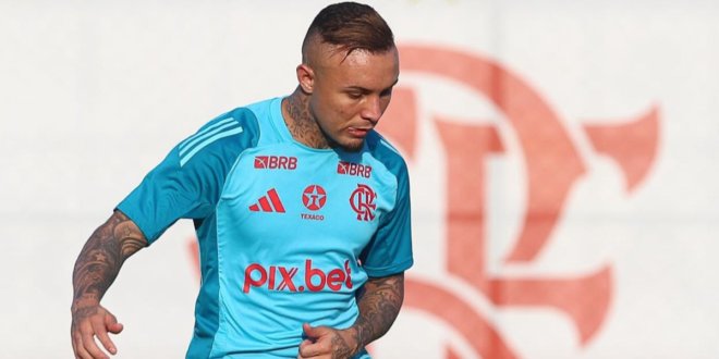 Na última sexta-feira (14), Everton Cebolinha foi reintegrado ao elenco e participou das atividades no campo do CT George Helal. Em nota oficial, o clube informou: “O atacante foi reintegrado ao grupo e realizou parte do treinamento no campo do CT George Helal. O jogador tem apresentado boa evolução ao longo da semana”. Dessa forma, Filipe Luís tem grande chance de relacioná-lo para a grande final.