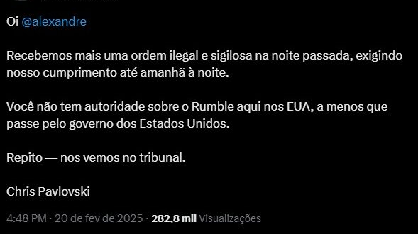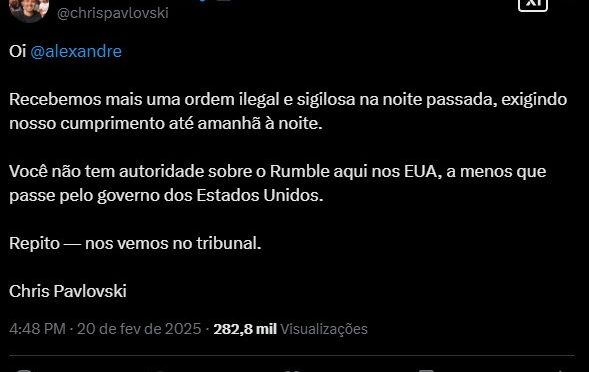 “Oi, Alexandre (@alexandre, o nome de usuário do ministro), recebemos mais uma ordem ilegal e sigilosa na noite passada (quarta-feira, 19), exigindo nosso cumprimento até amanhã à noite (sexta-feira, 20). Você não tem autoridade sobre o Rumble aqui nos EUA, a menos que passe pelo governo dos Estados Unidos. Repito — nos vemos no tribunal.”