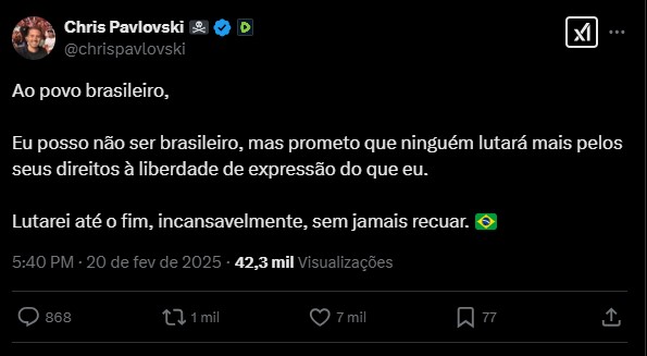 “Ao povo brasileiro, eu posso não ser brasileiro, mas prometo que ninguém lutará mais pelos seus direitos à liberdade de expressão do que eu. Lutarei até o fim, incansavelmente, sem jamais recuar”, escreveu ele no X, logo após anunciar a nova ordem de Moraes.