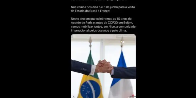 “Caro Lula, vamos escrever a próxima página juntos? Nos vemos nos dias 5 e 6 de junho para a visita de Estado do Brasil à França! Neste ano em que celebramos os 10 anos do Acordo de Paris e antes do COP30 em Belém, vamos mobilizar juntos, em Nice, a comunidade internacional pelos oceanos e pelo clima”, diz a publicação de Macron, em português, acompanhada de uma foto dois dois líderes apertando as mãos.