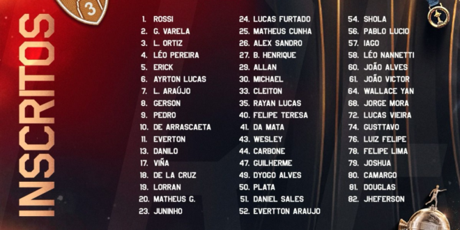 A Libertadores da América se inicia para o Flamengo na próxima quinta-feira (03), fora de casa, contra o Deportivo Táchira, na Venezuela. Diante da proximidade, o clube divulgou a lista dos jogadores que estão inscritos para vestir o Manto Sagrado ao longo da competição continental.