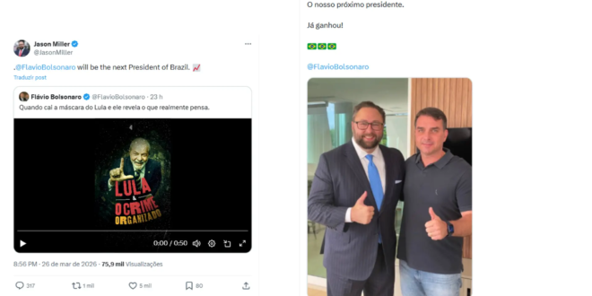 Em outra publicação, ele aparece em uma foto ao lado do pré-candidato, filho do ex-presidente Jair Bolsonaro, outro aliado do governo Trump, e sugere que o possível representante da direita nas eleições presidenciais já teria ganhado.