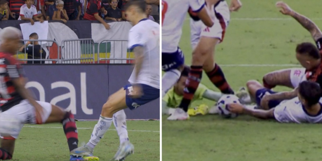 Logo após a expulsão de Gerson, o Flamengo protagonizou um ‘bate e rebate’ na área do Bahia. Durante o ataque do Mengão, um dos defensores da equipe baiana empurrou a bola com a mão para o goleiro Marcos Felipe. Apesar do VAR chamar para revisão, o árbitro mandou o jogo seguir e não marcou a penalidade.