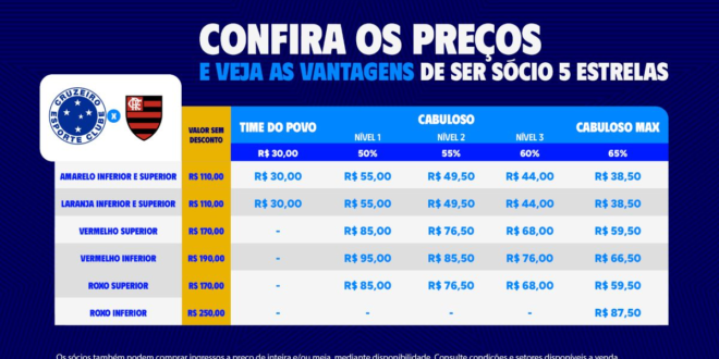 Assim sendo, a torcida rubro-negra ficará no setor Roxo Superior, que custa R$ 170 (R$ 85 meia). Nesta terça-feira (29), as vendas foram abertas para os sócios-torcedores do Cruzeiro, mas no dia seguinte ficam disponíveis para o público geral, a partir das 15h (horário de Brasília). Os interessados podem adquirir as entradas pelo site ingressos.flamengo.com.br.