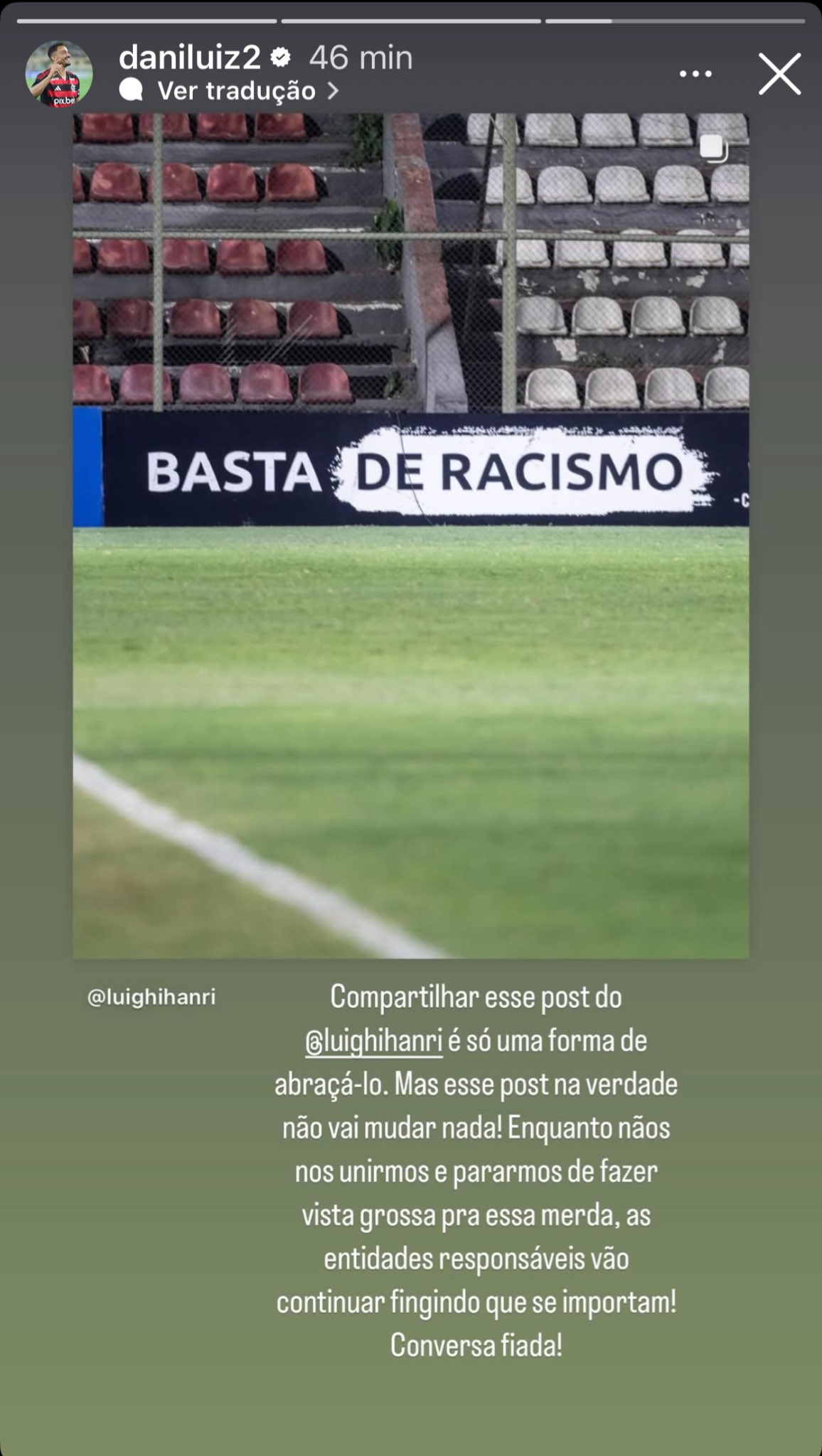 “Compartilhar esse post do Luighi é só uma forma de abraçá-lo. Mas esse post na verdade não vai mudar nada, enquanto não nos unirmos e pararmos de fazer vista grossa para essa m*rd*. As entidades responsáveis continuam fingindo que se importam. Conversa fiada!”, disparou Danilo, em publicação nas redes sociais.