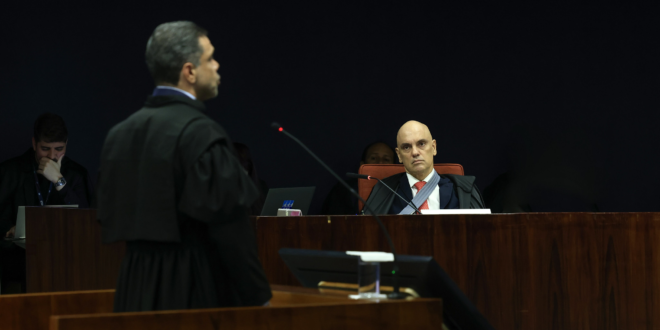 A sessão começou com o relator, ministro Alexandre de Moraes, apresentando um resumo do caso. Depois, falou a representante do procurador-geral da República, Paulo Gonet, e os advogados de defesa, em ordem alfabética.