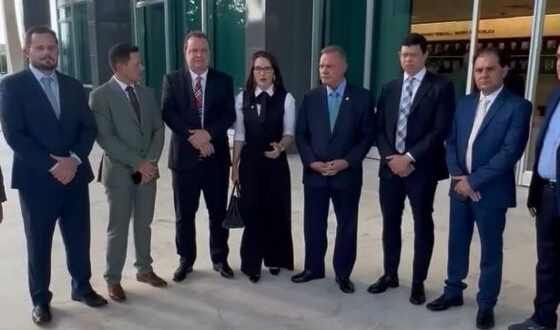 O presidente da Assembleia Legislativa de Mato Grosso, Max Russi (PSB), junto dos também deputados estaduais Janaina Riva (MDB), Wilson Santos (PSD) e Chico Guarnieri (PRD) se reuniram nesta quarta-feira (19), com o ministro do Supremo Tribunal Federal (STF), Flávio Dino, para tratar sobre a lei estadual que trata dos incentivos fiscais às empresas signatárias do pacto da moratória da soja.