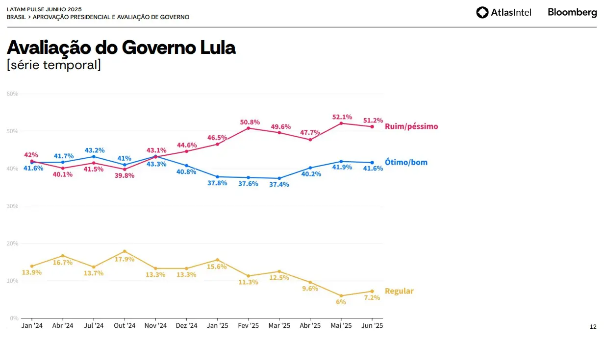 A desaprovação ao governo do presidente Luiz Inácio Lula da Silva (PT) segue acima da aprovação de acordo com uma nova rodada da pesquisa AtlasIntel em parceria com a Bloomberg divulgada nesta terça (8).