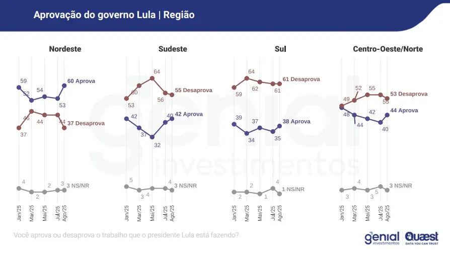 Os maiores ganhos na aprovação de Lula ocorreram nas regiões Nordeste e no Centro-Oeste, enquanto que a desaprovação teve uma queda tímida nos estados do Sudeste e Sul: