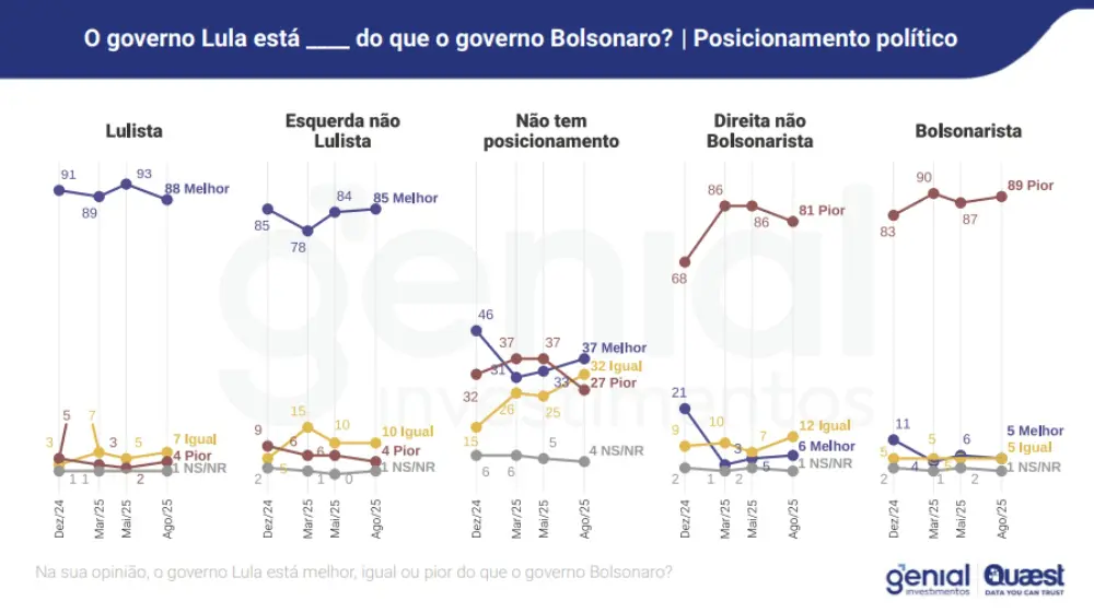 No entanto, ao se detalhar os dados desta pesquisa comparativa, a polarização política persiste entre os apoiadores de Lula e de Bolsonaro: