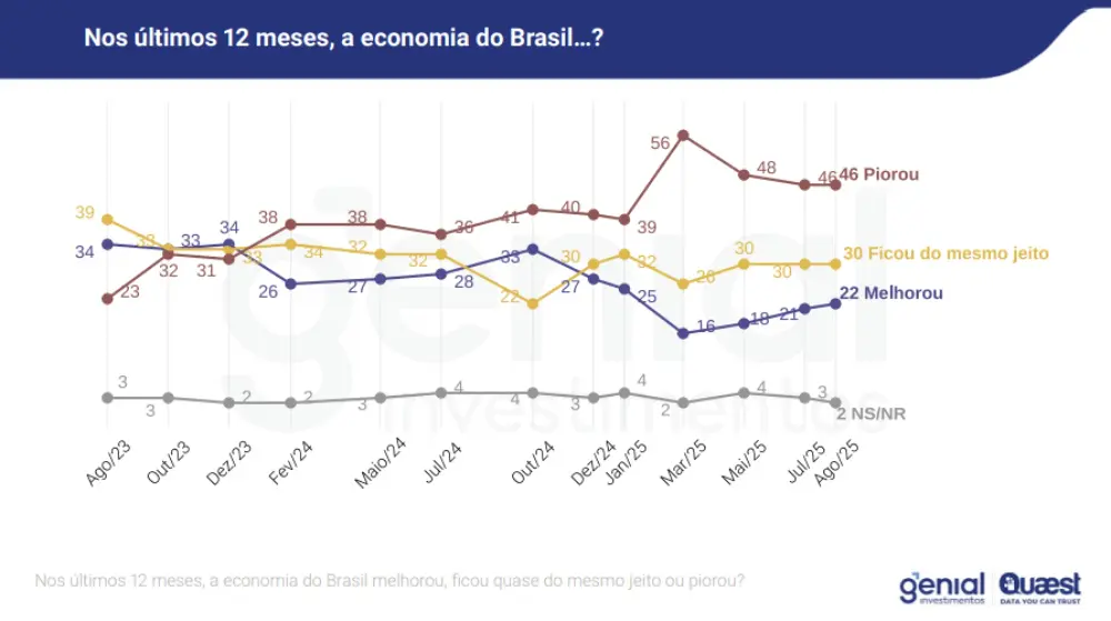 Em uma percepção geral, a economia brasileira piorou nos últimos 12 meses para 46% dos entrevistados, enquanto que 22% veem uma melhora. Outros 30% sentem que ficou do mesmo jeito: