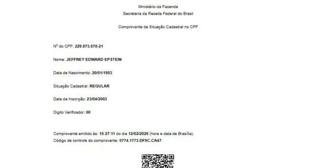 A Gazeta do Povo entrou em contato com a Receita Federal para comentar a existência do CPF em nome de Epstein, mas o órgão não se manifestou até a publicação desta matéria. O texto será atualizado quando houver resposta.