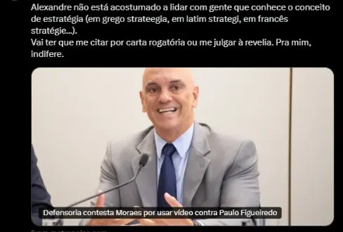 O ministro justificou sua decisão em razão do jornalista estar “em país estrangeiro e em endereço desconhecido”, afirmando não haver como notificá-lo de outra forma. E como Figueiredo publicou vídeos em suas redes sociais onde comentava o processo do 8 de janeiro, Moraes considerou que ele sabia de sua citação e determinou que a DPU apresentasse a sua defesa.