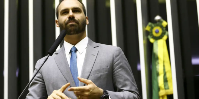 O deputado licenciado Eduardo Bolsonaro concedeu entrevista à Folha de S.Paulo nesta segunda-feira (14). Ele afirmou que o presidente americano Donald Trump não recuará da decisão de impor uma tarifa de 50% sobre produtos brasileiros a partir de 1º de agosto. Segundo o deputado, a única forma de se iniciar uma negociação com os EUA seria, em primeiro lugar, por meio da aprovação da anistia aos manifestantes que contestaram o resultado das eleições presidenciais a partir de 30 de outubro de 2022.