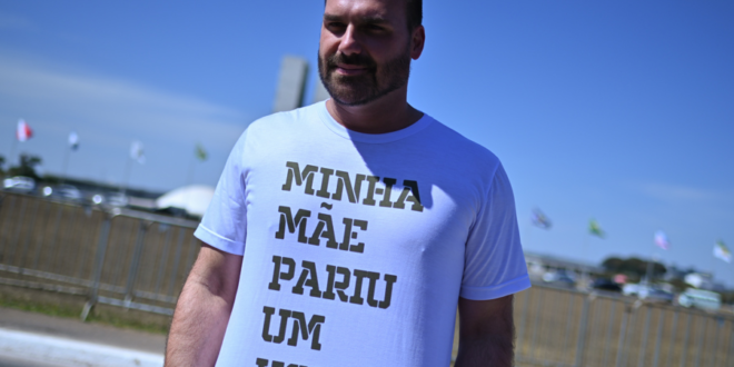 Eduardo Bolsonaro está nos Estados Unidos. No Brasil, enfrenta uma ação no STF por suposta coação e obstrução às investigações. Eduardo critica a conduta: “Eu não posso ter o direito de achar que é uma perseguição? […] Aí você censura a gente e a gente não pode expor a sua censura.”