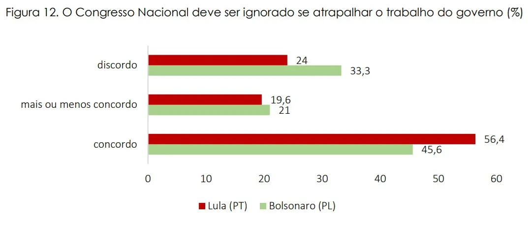 No que tange a relação da presidência com os tribunais, 71,6% e 71,1% dos eleitores de Lula e Bolsonaro, respectivamente, consideram que os tribunais devem ser capazes de impedir o governo de agir além de sua autoridade. Mas 49,1% dos lulistas dizem que o presidente deve “poder ignorar as decisões judiciais consideradas politicamente”. Um percentual bem menor de eleitores de Bolsonaro, 42,4%, concorda com a afirmação. Tendência semelhante se manifesta sobre a afirmação de que o Congresso Nacional deve ser ignorado se atrapalhar o trabalho do governo: 56,4% dos lulistas contra 45,6% dos bolsonaristas concordam.