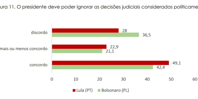 Quem votou em Lula em 2022 demonstra maior propensão a apoiar que o presidente ignore decisões judiciais tendenciosas do que os eleitores de Bolsonaro (49,1% versus 42,4%). (Foto: Foto: Reprodução / Pesquisa “Entre o Princípio e a Conveniência: o paradoxo da atitude democrática dos brasileiros”)