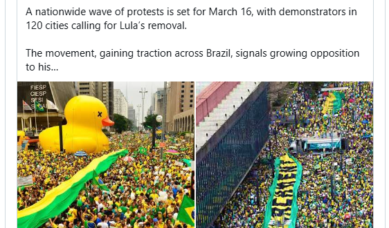 De acordo com o autor do post, que acompanha fotos das manifestações de 2016 pelo impeachment da ex-presidente Dilma Rousseff (PT), “o movimento está ganhando tração pelo Brasil graças aos crescentes sinais de oposição ao governo (Lula)”.