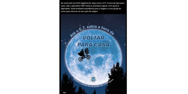 O perfil oficial da Embaixada dos Estados Unidos no Brasil fez uma postagem em português, nesta quarta-feira (23), contra a imigração ilegal fazendo uma alusão ao personagem fictício do filme E.T, dos anos 80: “Se você está nos EUA ilegalmente, faça como o E.T.: é hora de ligar para casa. Use o aplicativo CBP Home e vá embora agora, com apoio e dignidade. Você receberá assistência para a viagem e uma ajuda de custo para retornar ao seu país de origem”.