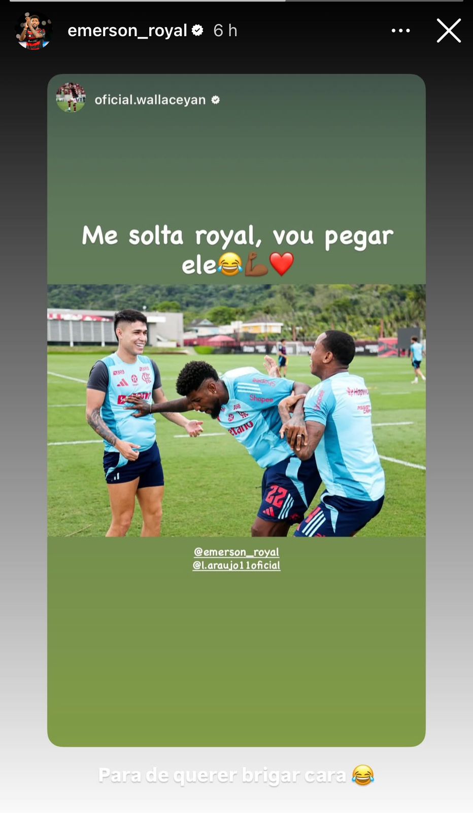 Por meio das redes sociais, Wallace Yan publicou uma foto na qual Royal aparece no meio segurando o cria do Ninho e Luiz Araújo. Na hora da resposta, o lateral direito, na resenha, escreveu o seguinte: “para de querer briga, cara”.